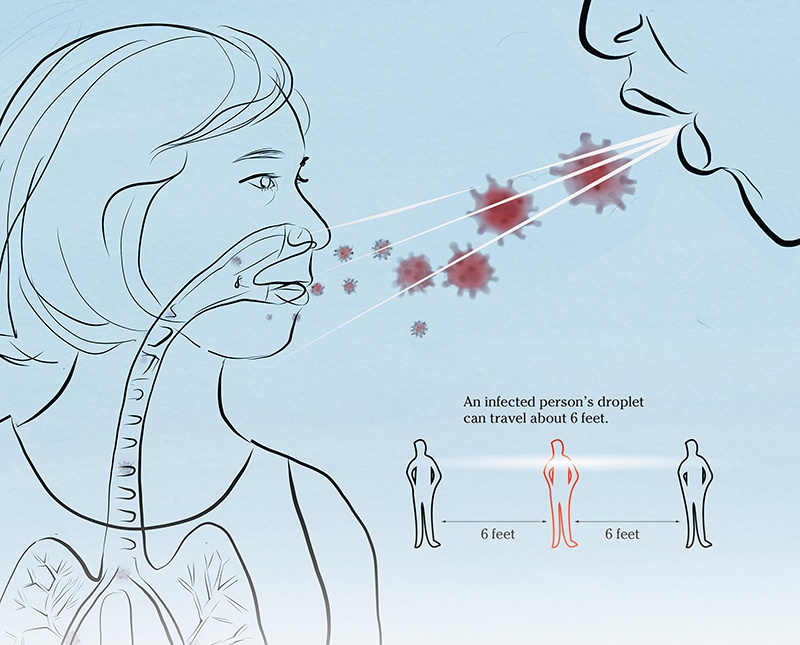 Like cold and flu bugs, the virus is spread via droplets when a person coughs or sneezes. The droplets land on surfaces and are picked up on the hands of others and spread further. People catch the virus when they touch their infected hands to their mouth, nose or eyes.